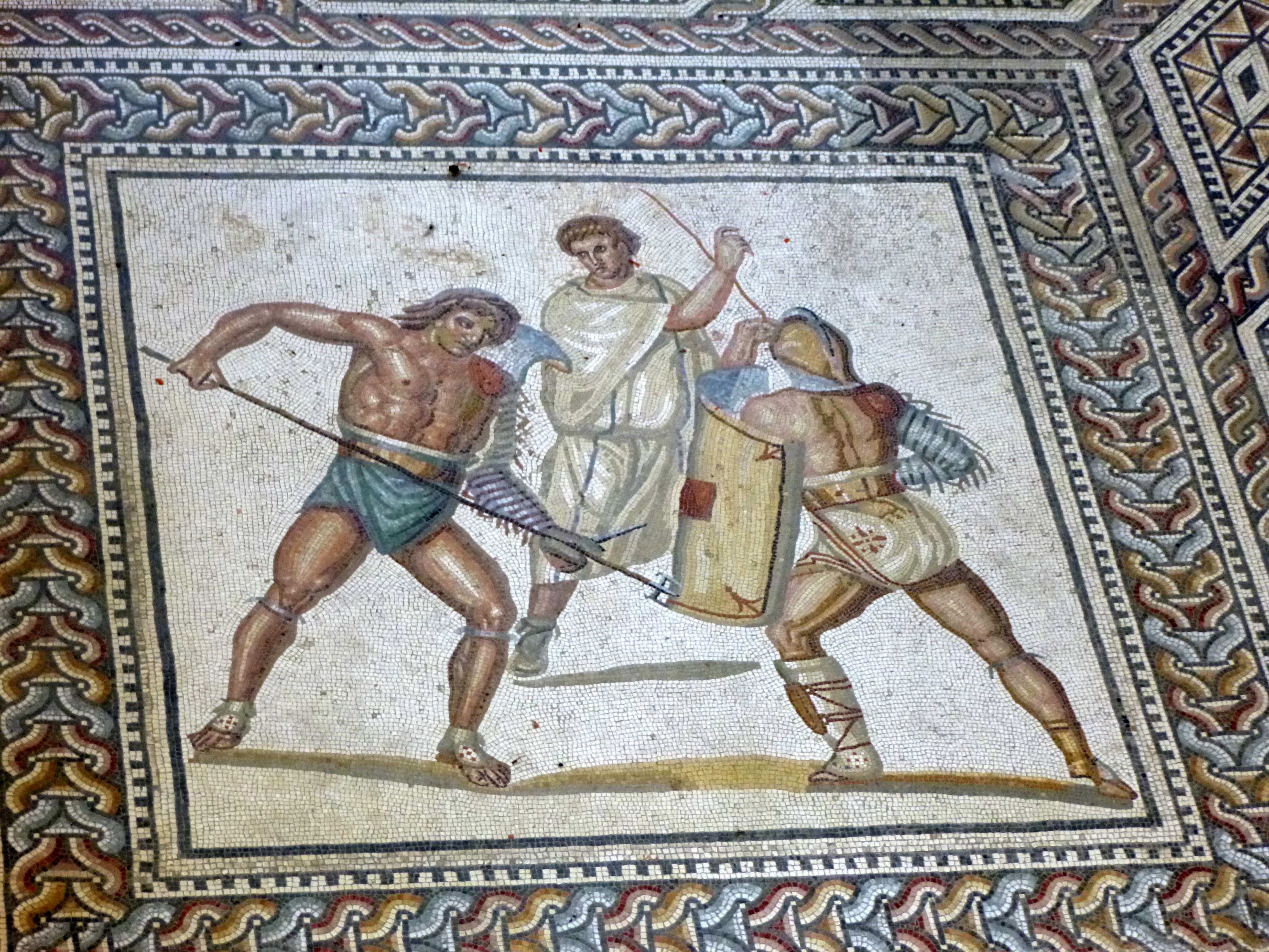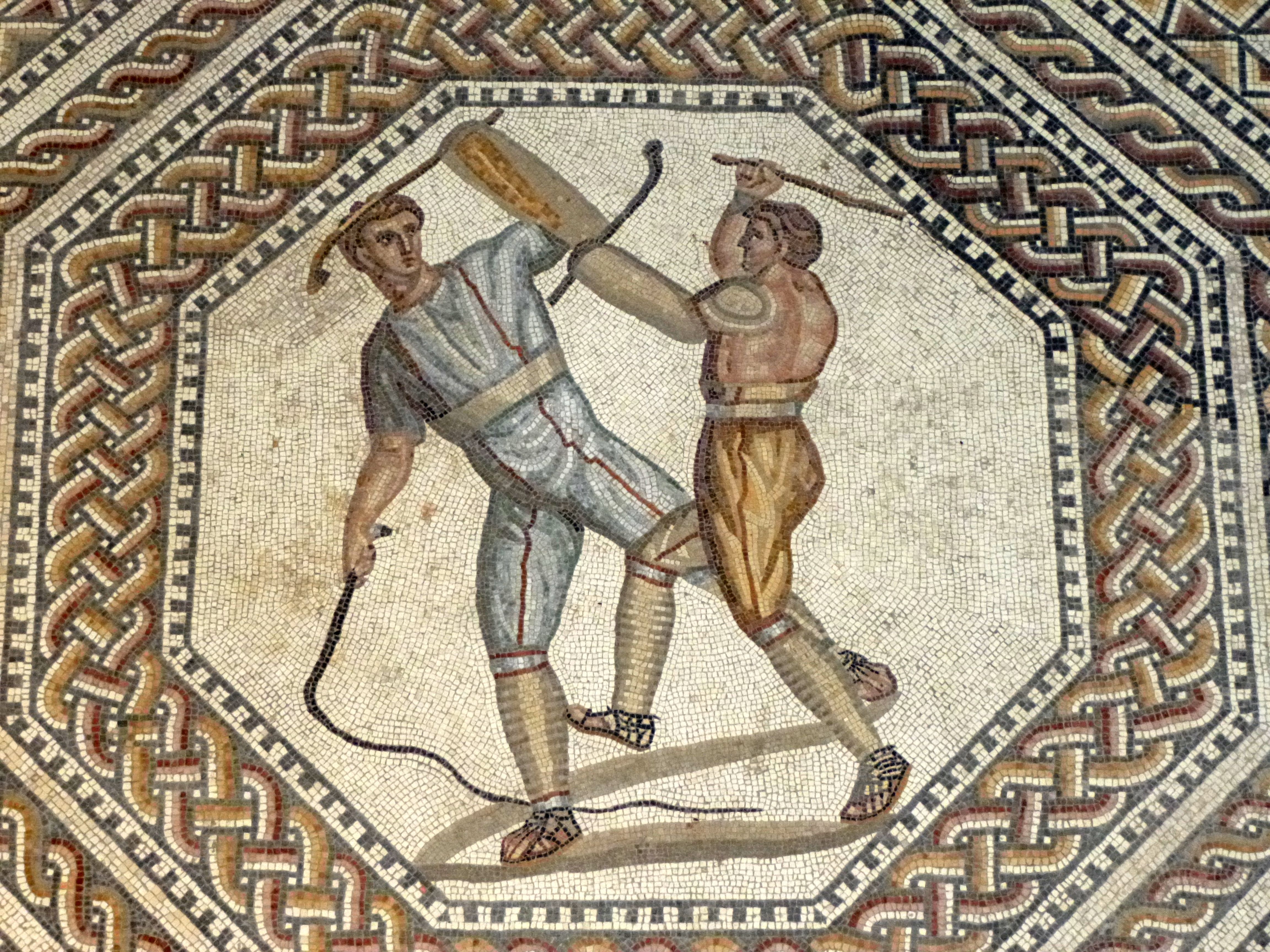 der LANISTA (=Schiedsrichter), rechts ein MURMILLO |