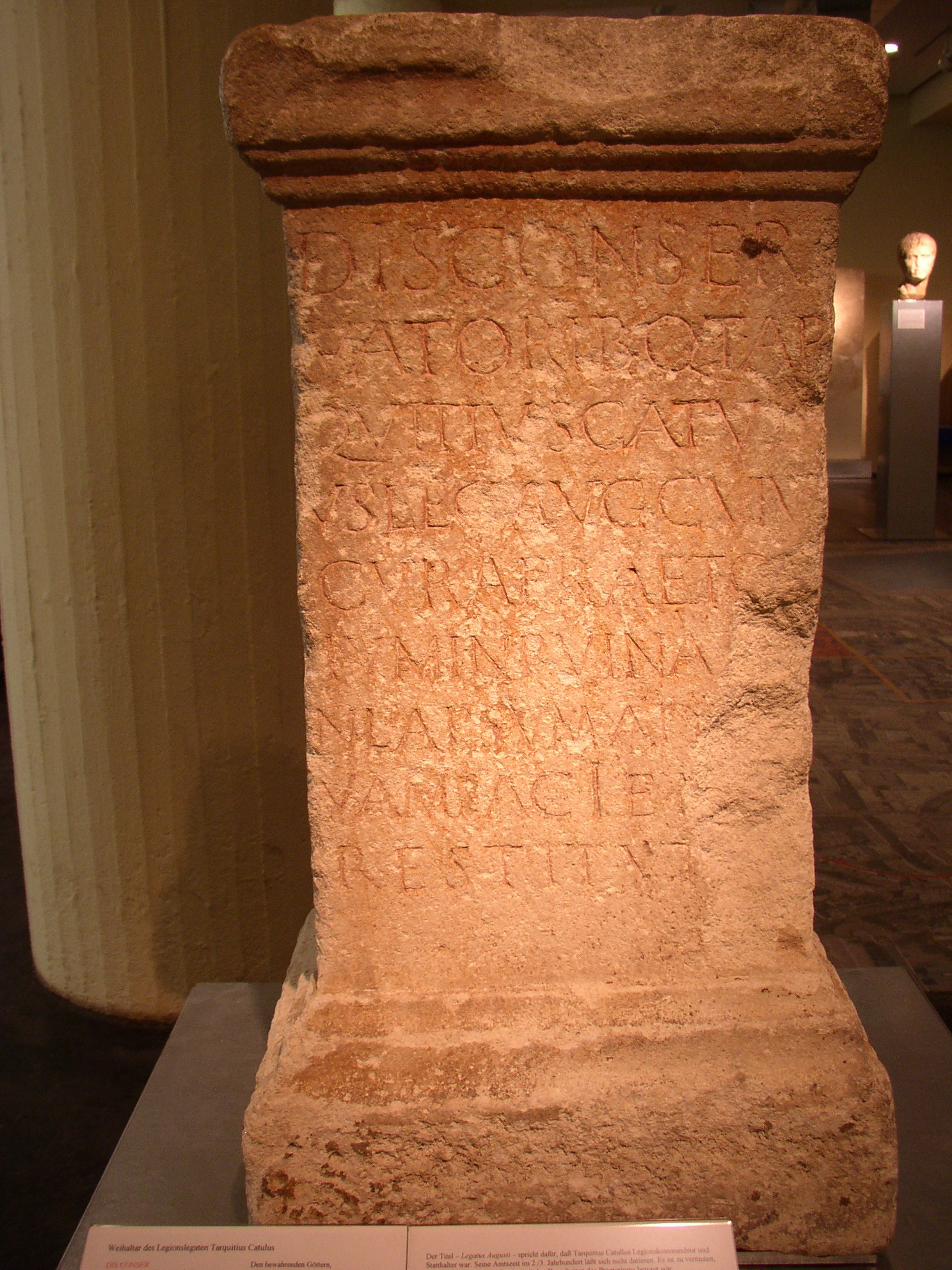 Weihestein des Catulus: DIS CONSERVATOrIBus Quintus TARQUITIUS CATULUS LEGatus AUGusti CUIUs CURA PRAETOrIUM IN RUINAm coLAPSUM AD noVAM FACIEm est RESTITUTum. Den Göttern, den bewahrenden. Quintus Tarquitius Catulus, Legat des Kaisers, durch dessen Sorge das Praetorium, das in Ruinen zusammengefallen war, in neuer Gestalt wiederhergestellt worden ist. (Text und übersetzung nach WOLFF, S.180) |