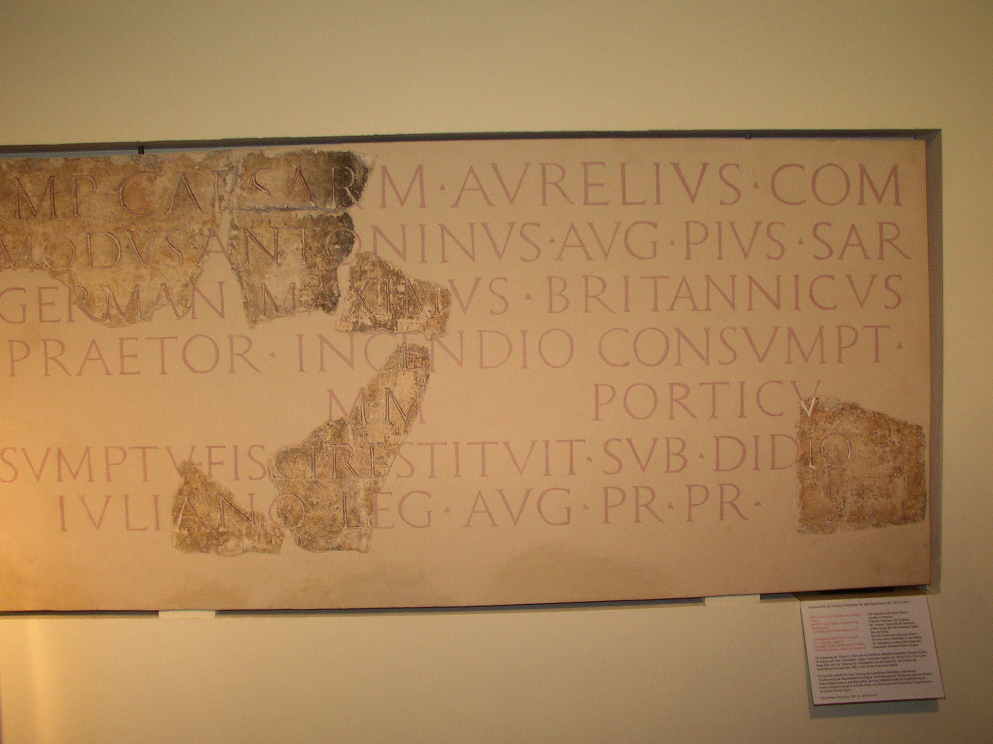Inschrift des Commodus: IMPerator CAESAR marcus aurelius comMODUS ANTOninus augustus pius sarmaticus geRMANicus MAXIMus britannicus praetorium incEndio consumptum M M porticU sumptU fisCI REStituit sub diDIO iuliANO Legato augusti pro praetore Der Imperator, Caesar Marcus Aurelius Commodus Antoninus Augustus, der fromme, Sieger über die Sarmaten, Germanen und Britannier, hat das Praetorium, das durch Brand vernichtet worden war, mit der Säulenhalle auf Kosten der kaiserlichen Kasse wiederaufgebaut unter Didius Iulianus, dem Legaten des Augsutus im Range eines Praetors. (Text und übersetzung nach WOLFF, S.181) |