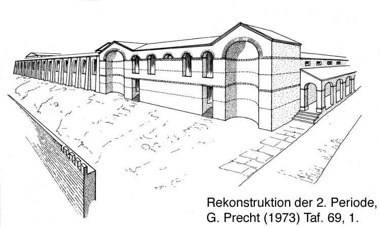 Zeichung des Baus II (Konchenbau), vom Rhein aus gesehen