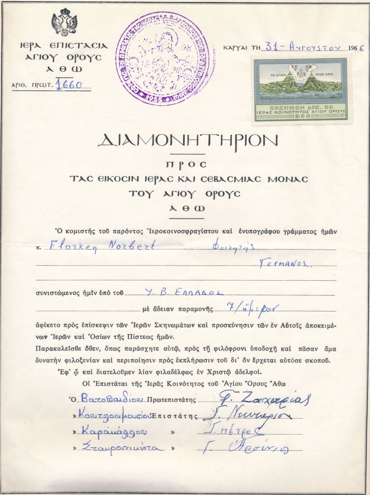 Διαμονητηριον = Diamonitirion = Visum für die Mönchsrepublik Athos 1966