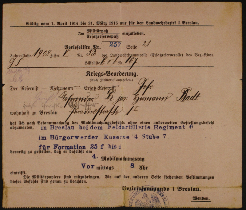 Bezirkskommando Breslau. (01. April 1914). Kriegs-Beorderung Hermann Badt. (2002/31/5). Jüdisches Museum Berlin.