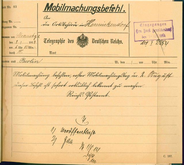 Abbildung 3: Telegramm Mobilmachung