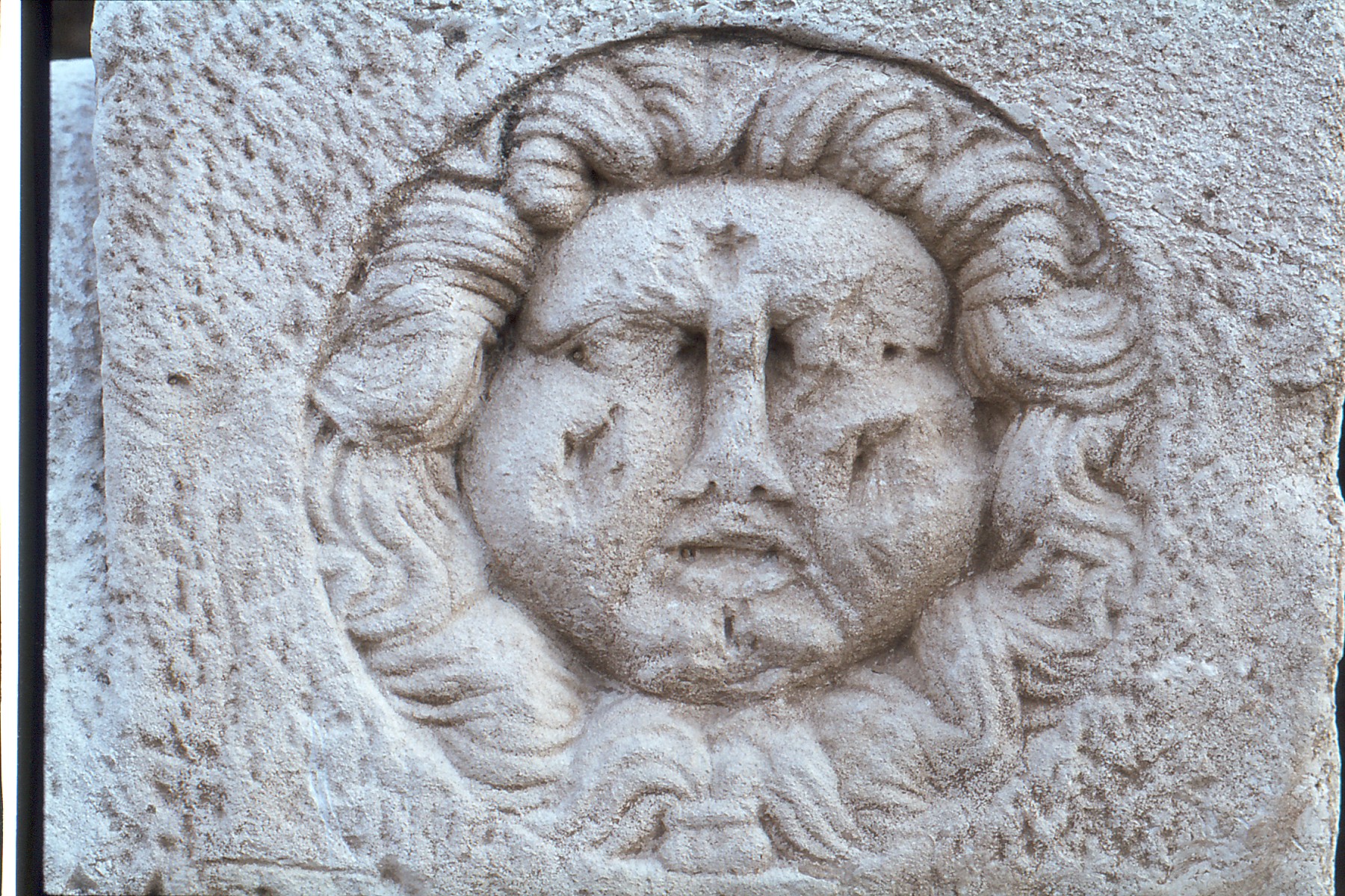 Die rekonstruierte Brunnenfassung mit den Medusenhäuptern links und
