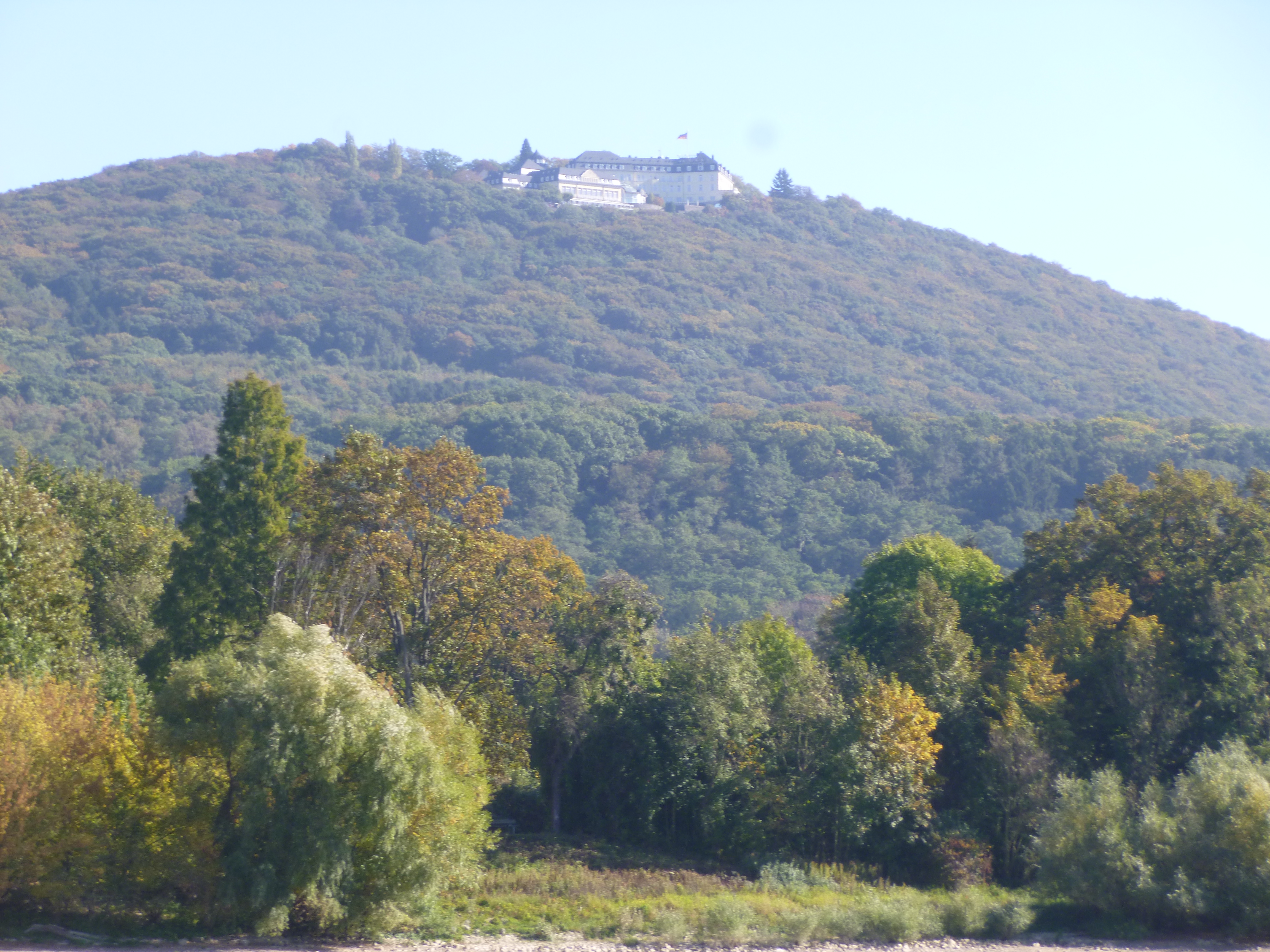 Der Petersberg, einer der "sieben" Berge des Siebengebirges. Bereits in frühgeschichtlicher Zeit besiedelt. Im 12. Jhdt. zunächst eine Klause, später eine Wallfahrtskapelle auf dem Gipfel. Ab Mitte des 19. Jhdts. Wohnbebauung, ab 1892 Hotel. 1938 wohnte der britische Premier Chamberlain währen der Verhandlungen im Dreesen (s.o.) dort. Von 1949 bis 1952 Sitz der Alliierten Hohen Kommission, anschliessend Gästehaus der Bundesregierung, u.a. für Königin Elisabeth II. (1965) und Leonid Breshnew (1973). |