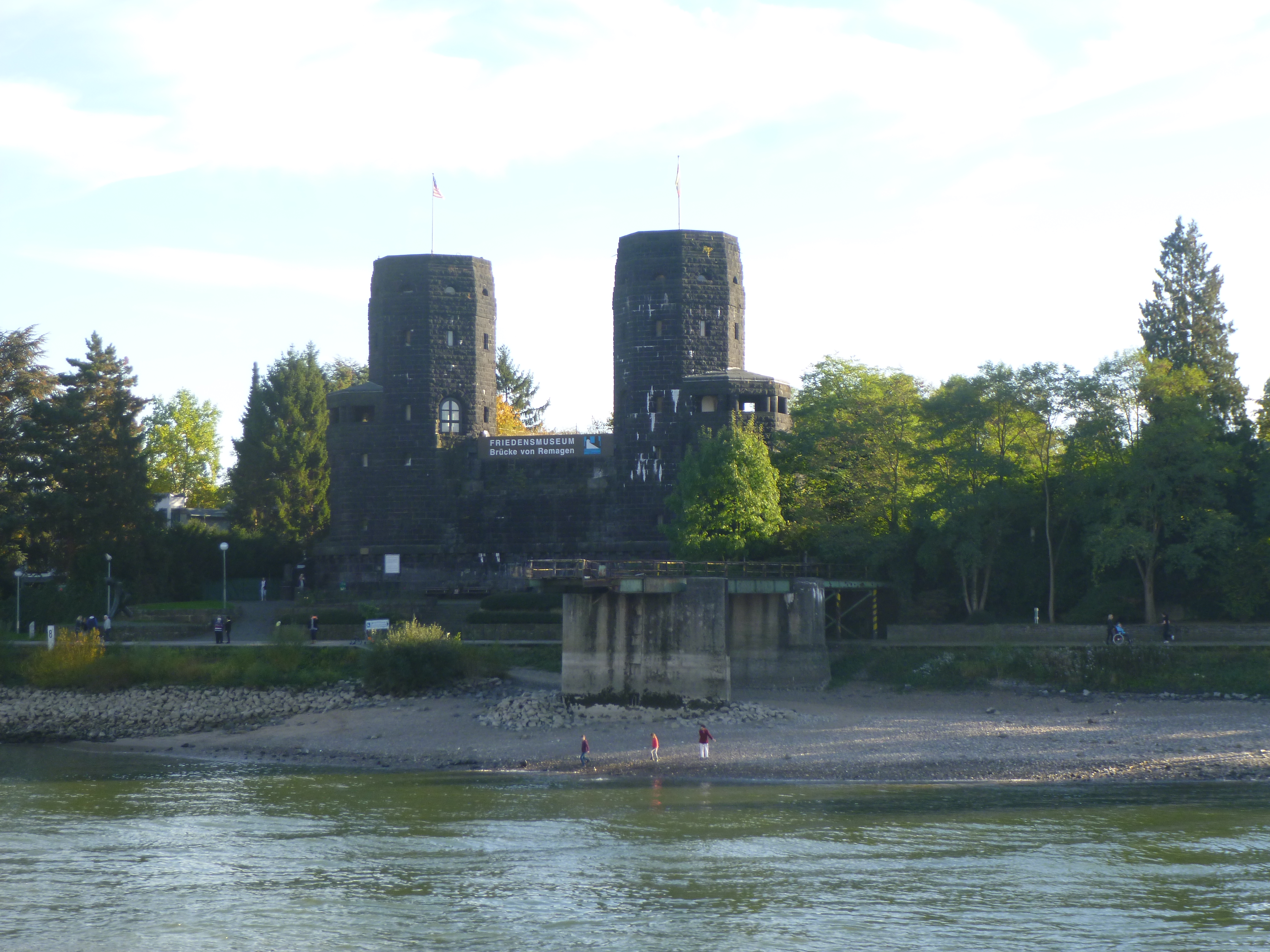 Die Reste der Ludendorff-Brücke von Remagen, als Eisenbahnbrücke erbaut im 1. Weltkrieg, benannt nach General Ludendorff. Am 07.03.1945 wurde die Brücke von der US-Armee eingenommen, nachdem deutsche Versuche, die Brücke befehlsgemäss zu sprengen, gescheitert waren: sie wurde zwar beschädigt, blieb aber intakt. Am 17.03.1945 stürzte die beschädigte Brücke wegen Überlastung dann doch ein, 17 US-Soldaten kamen dabei ums Leben. Ein "Fliegendes Standgericht" der deutschen Wehrmacht verurteilte am 09.03.1945 fünf deutsche Offiziere zum Tode und liess vier sofort erschiessen. Heute ist der linksrheinische Brückenturm ein Museum. |