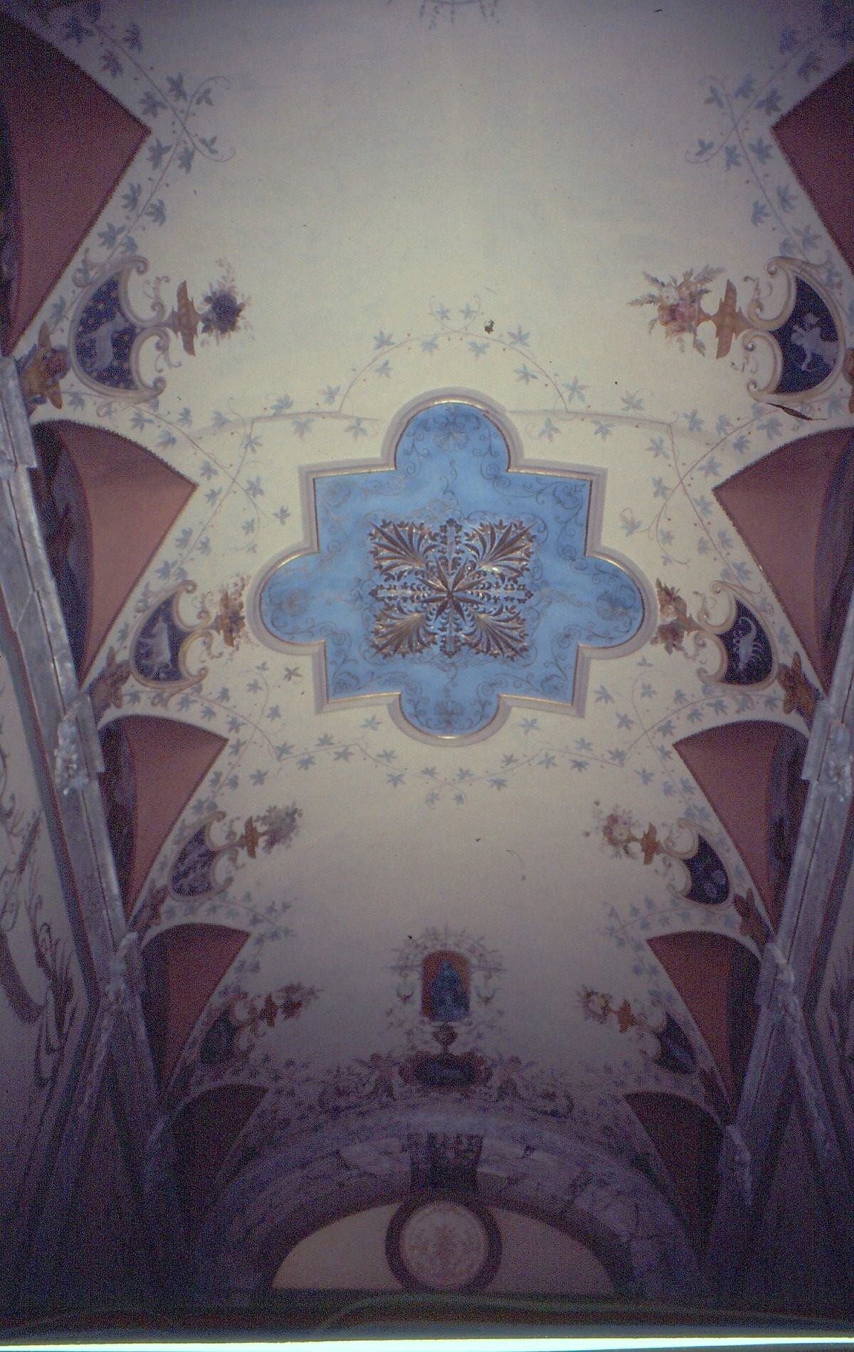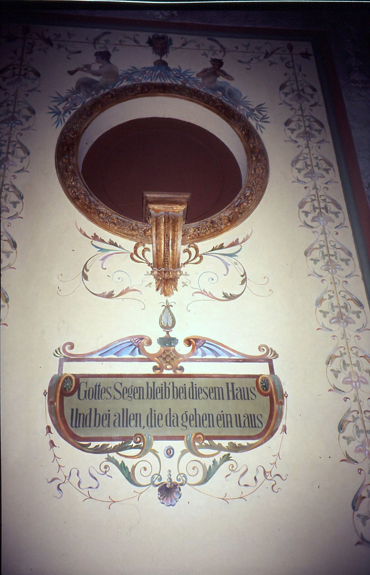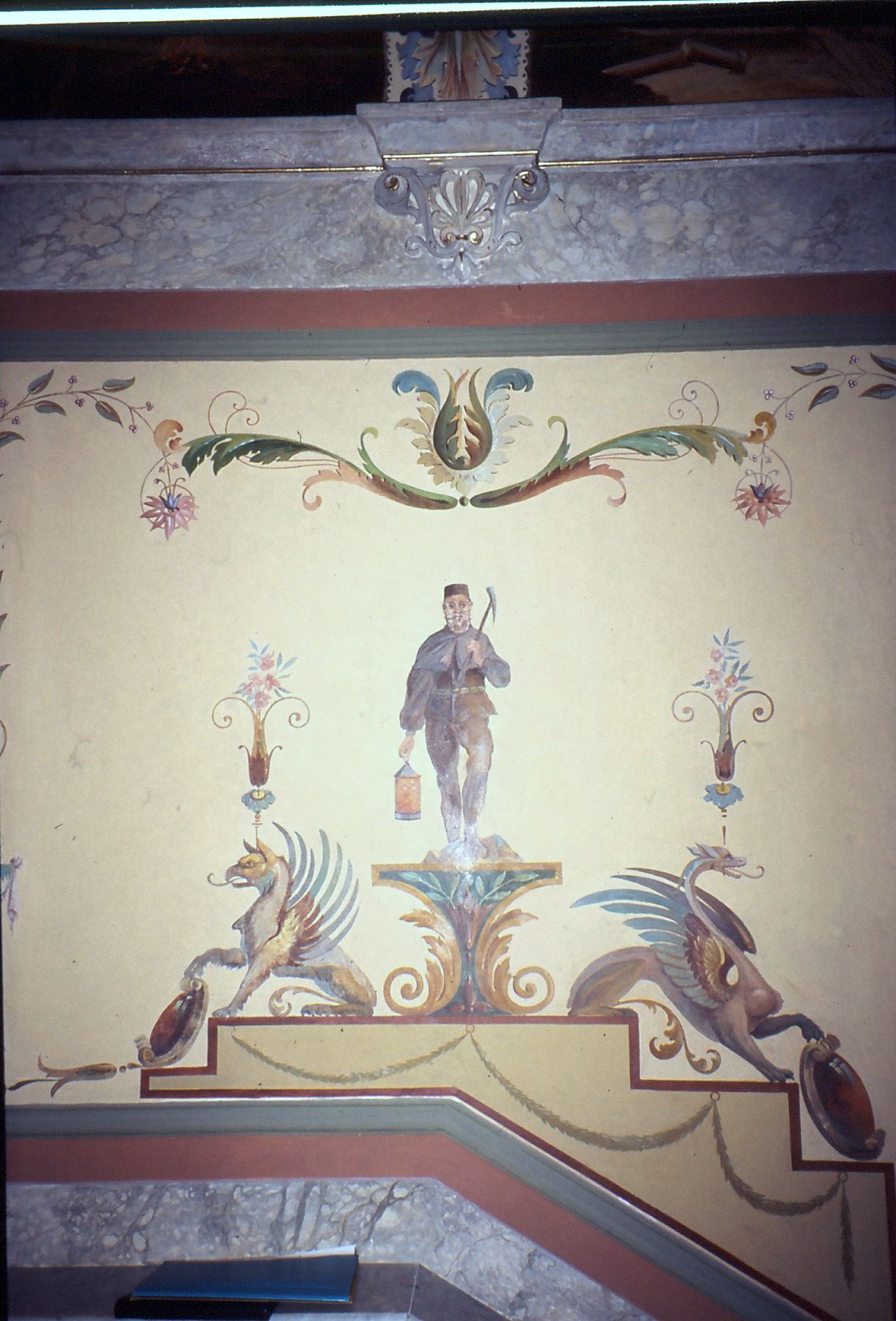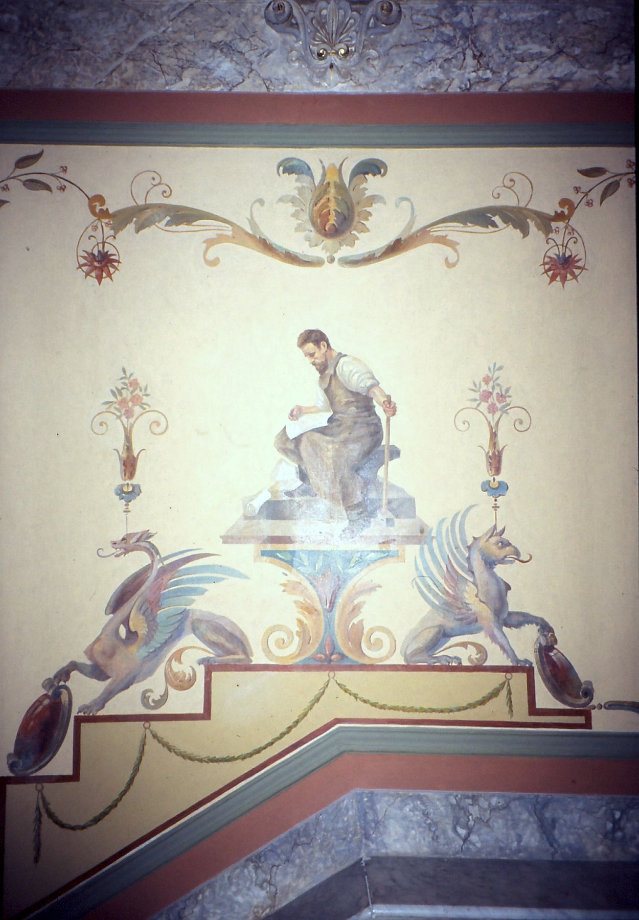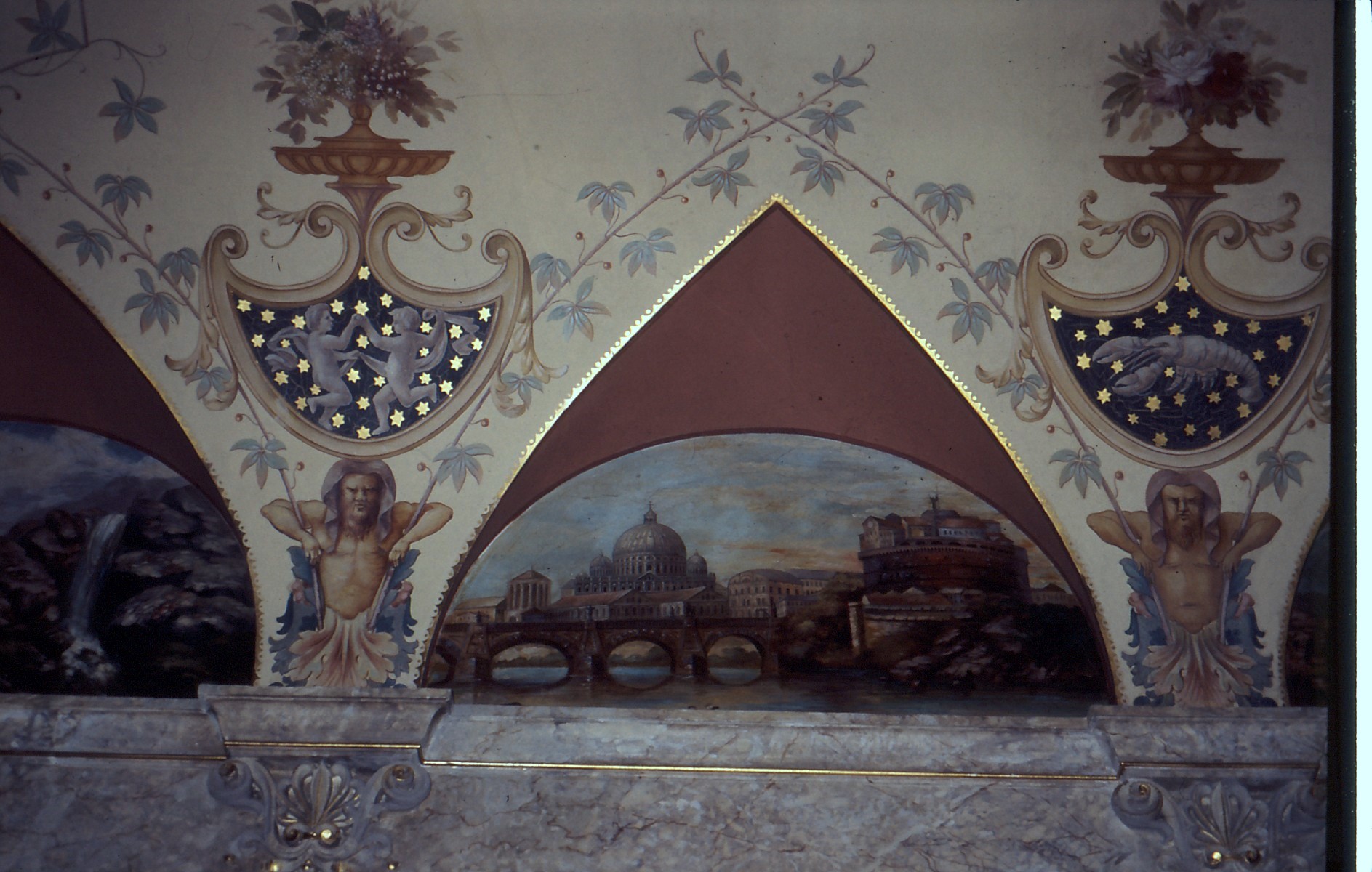 Auch aber ist die Gestaltung der Innenräume dem Erbauer und den Künstlern hervorragend geglückt. Jeder der sehr hohen Räume besitzt seine eigenen Stuckaturen, Wandbilder und Marmorverzierungen und ist mit feinsten Parkett ausgelegt. Besonders erwähnenswert ist auch das Tonnengewölbe. Trotz starker Risse zeigt es herrliche Stuckaturen mit Blatt- und geometrischen Ornamenten, die in verzierende Malereien übergehen. Ebenso zeigt es weitere Malereien figürlicher und ornamentaler Art, zum Teil manieristische Grotesken und Tierkreiszeichen. Die Untergliederung der Wände durch Lisenen grenzt wiederum Vierecksfelder ein, die durch stuckierte Rahmenprofile begrenzt und deren Flächen mit formalen Mustern bemalt sind. Neben den unterschiedlichen Rankenmotiven etc. müssen hier noch die beiden links und rechts oberhalb des Treppenaufgangs befindlichen antikisierten Büstentorsi genannt werden, die auf Postamenten vor den in die Wand eingelassenen Rundnischen ruhen.
