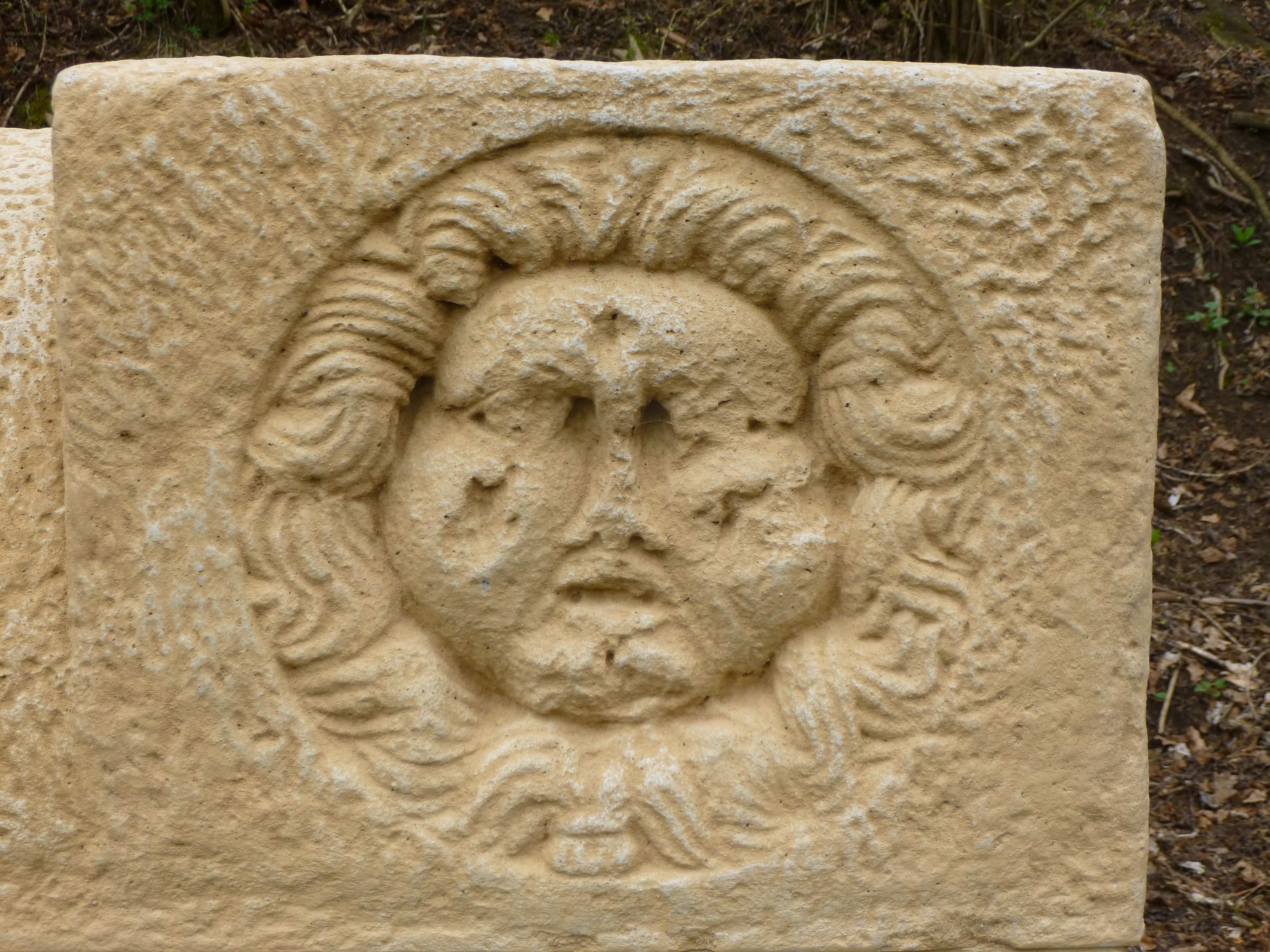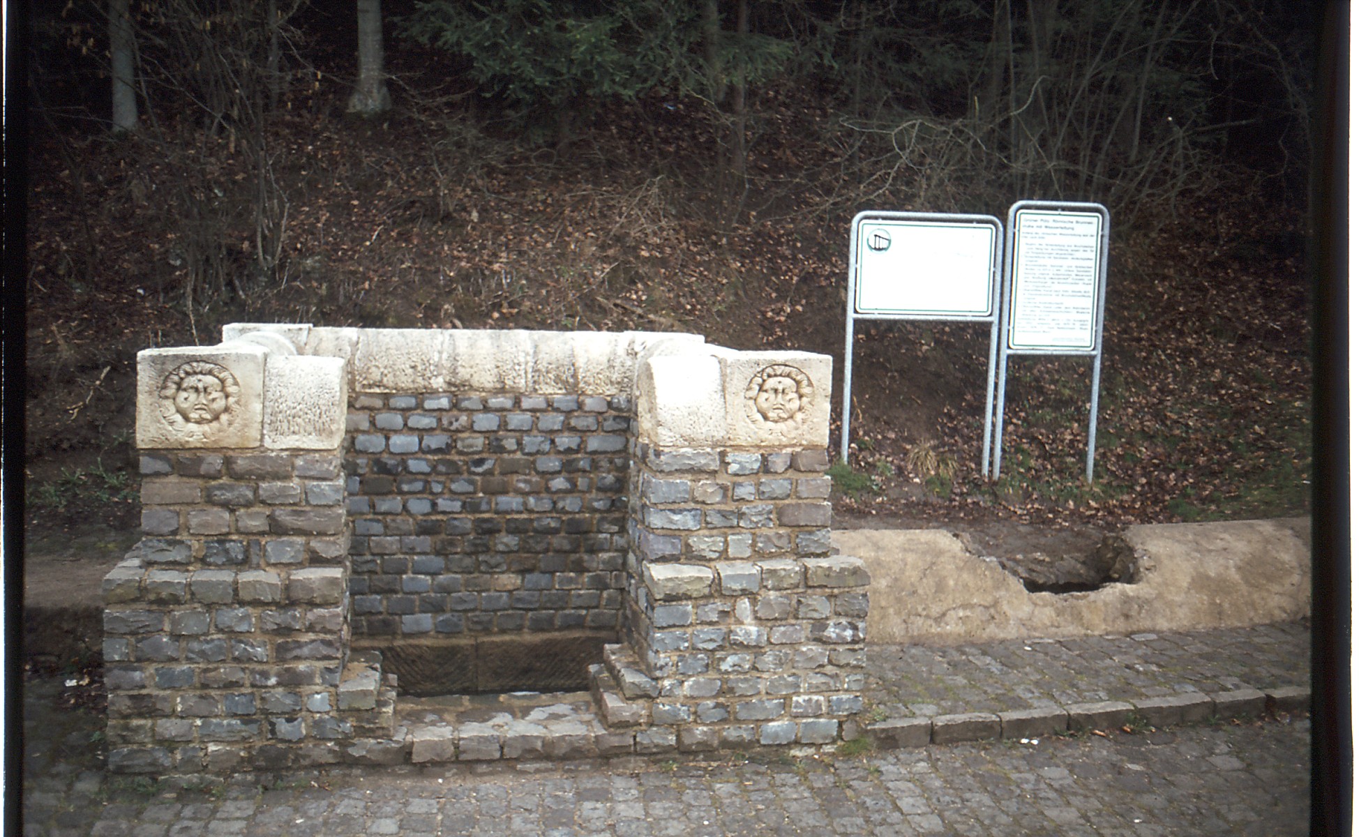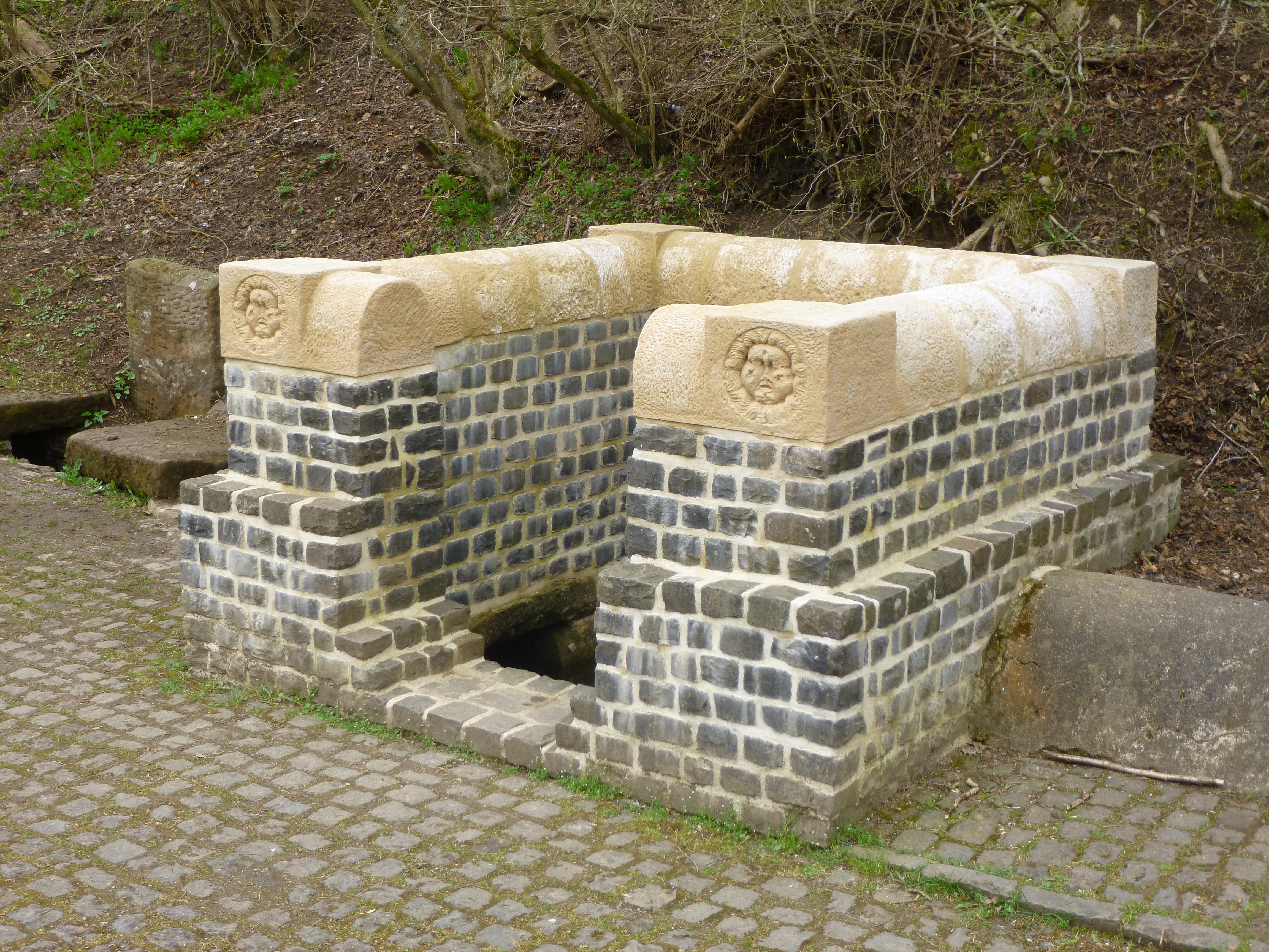 Die rekonstruierte Brunnenfassung mit den Medusenhäuptern links und